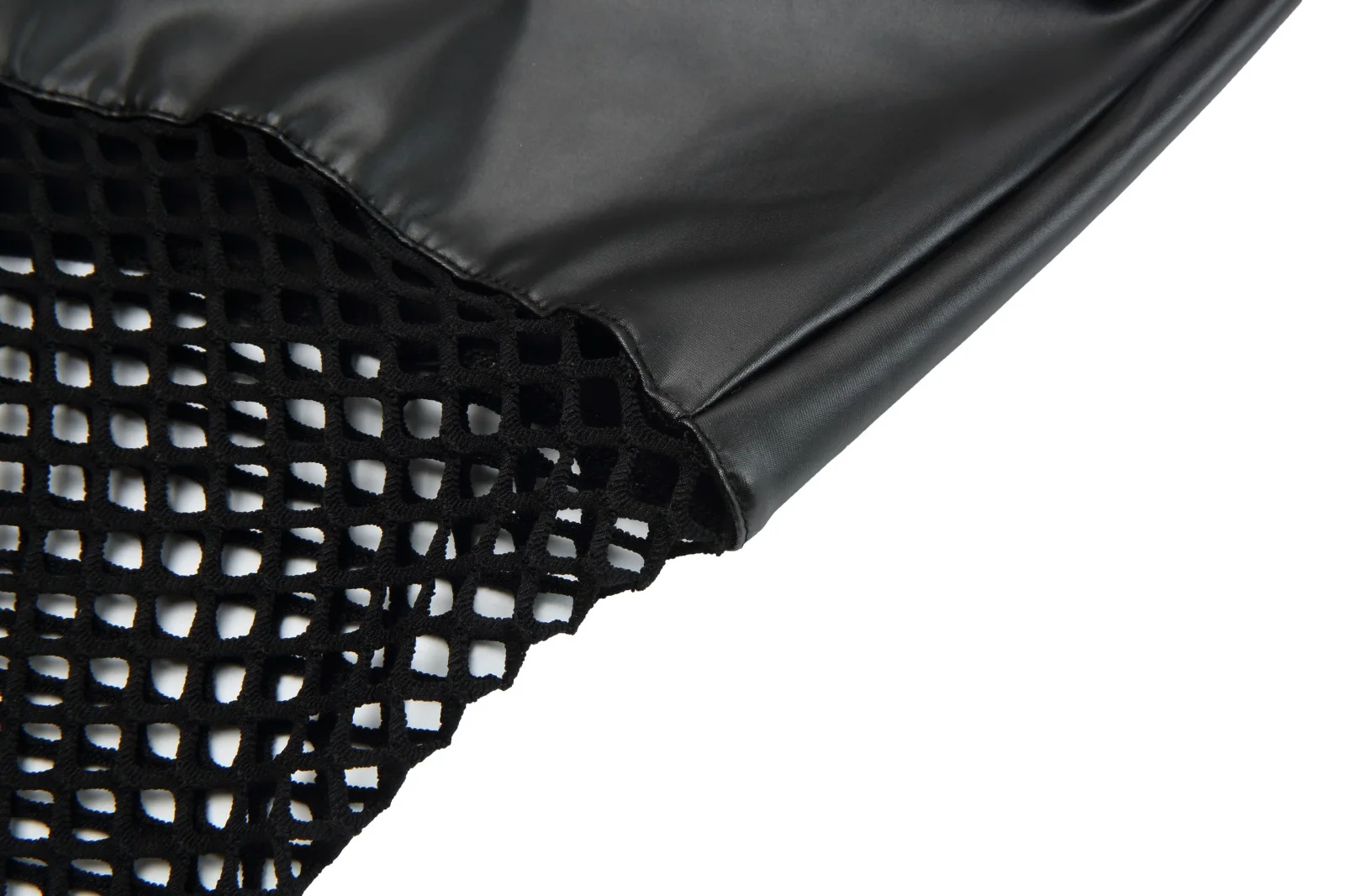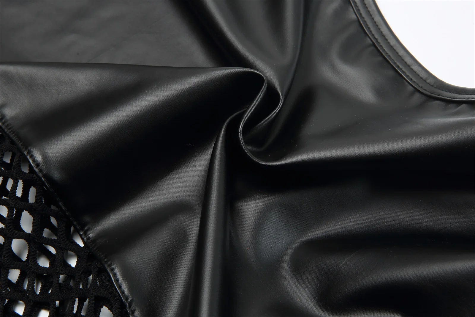 item name:Men's Sexy Imitation Leather Transparent O Neck Fishing Net Hollow Out Short Sleeve Top