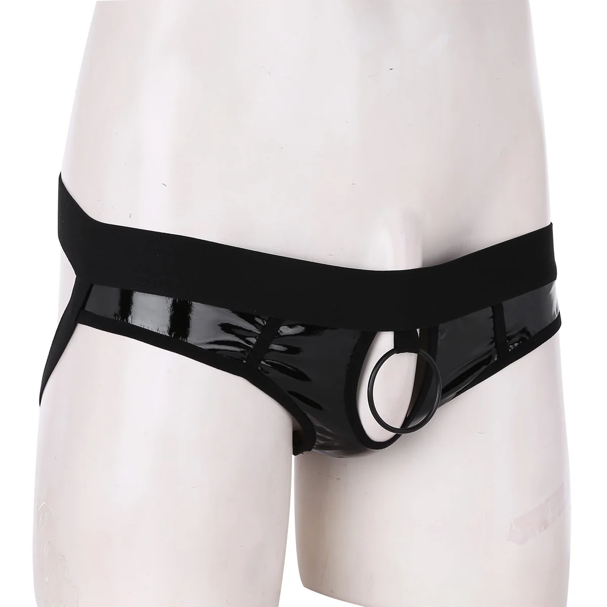 Mens Sexy Patent Leather Lingerie Hollow Out Bulge Pouch Latex Panties: Men Sexy Strings Jockstrap with Hole Metal
