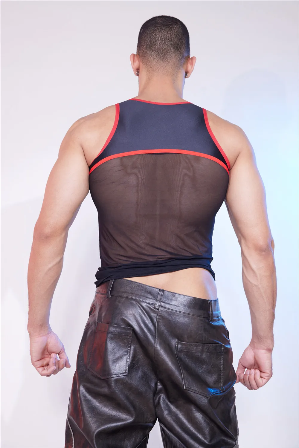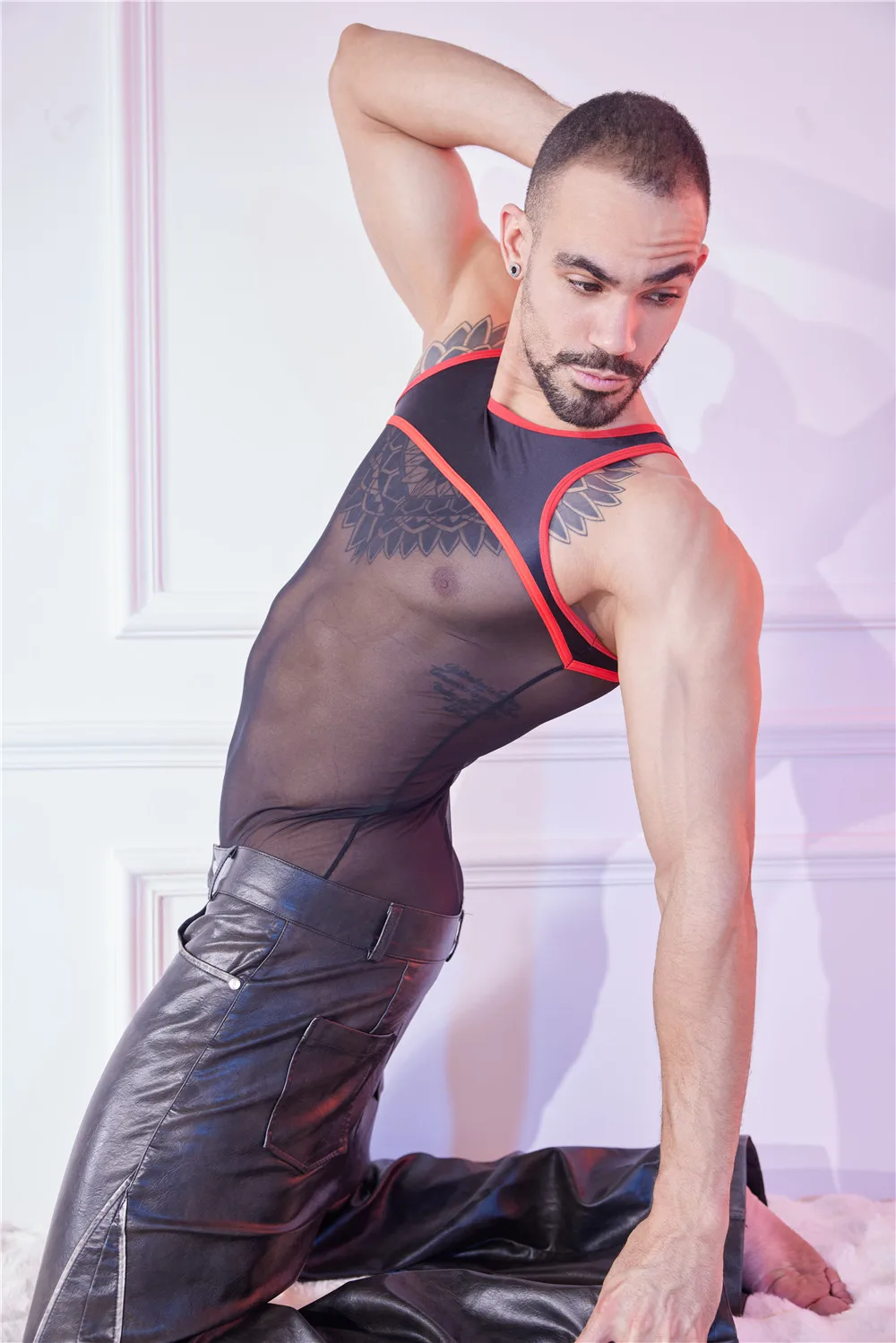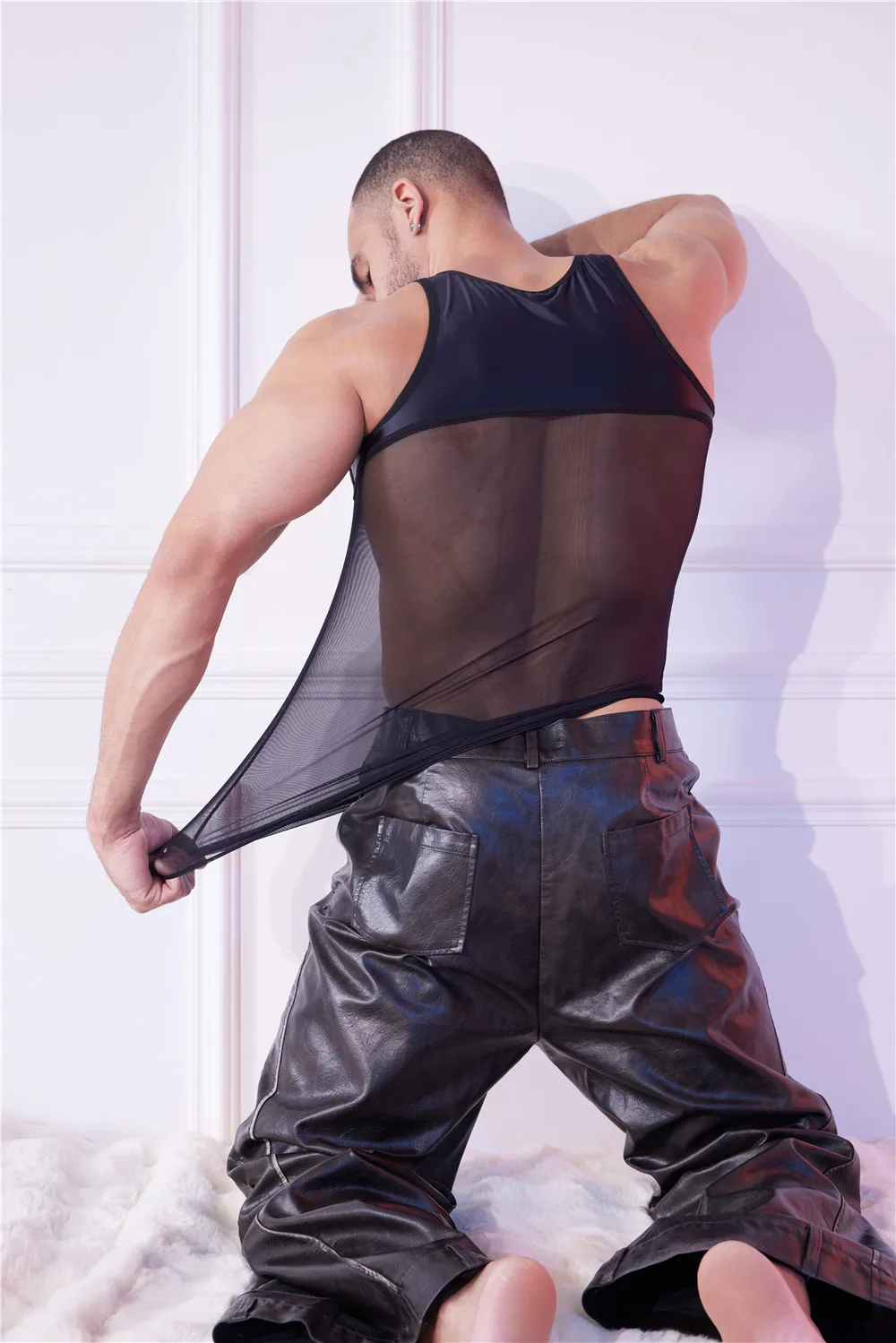 Sexy Men Patchwork Tank Top Oil Glossy Shiny Vest Mesh Sheer See Through Thong Maid Tights Elastic Shaper Top T-shirt