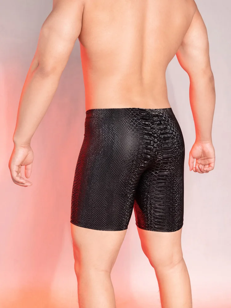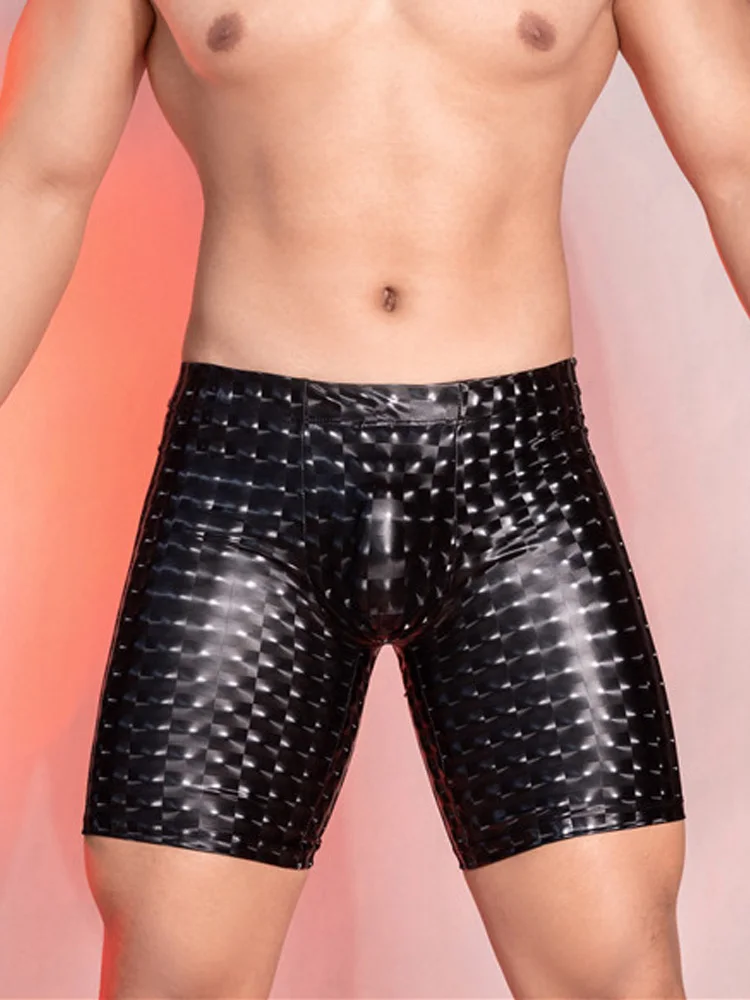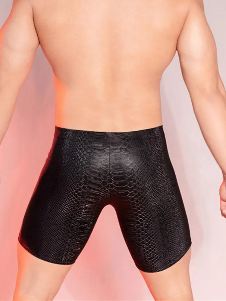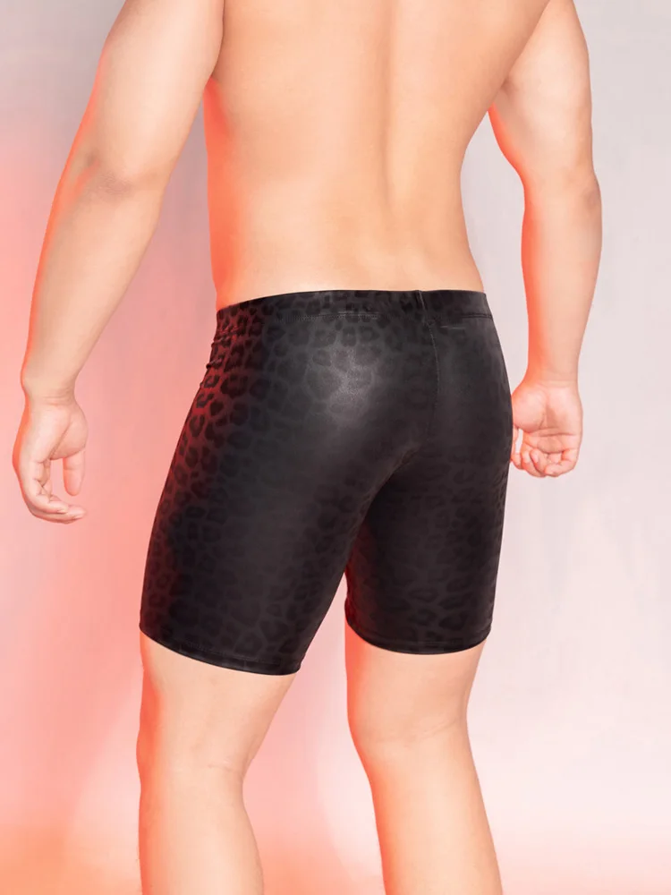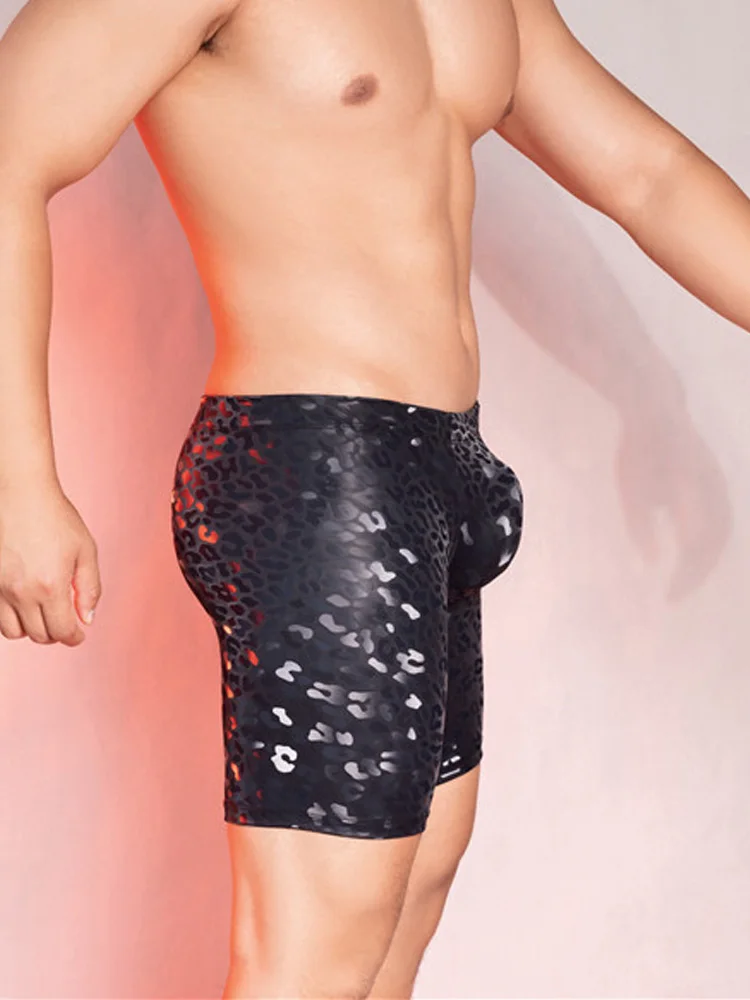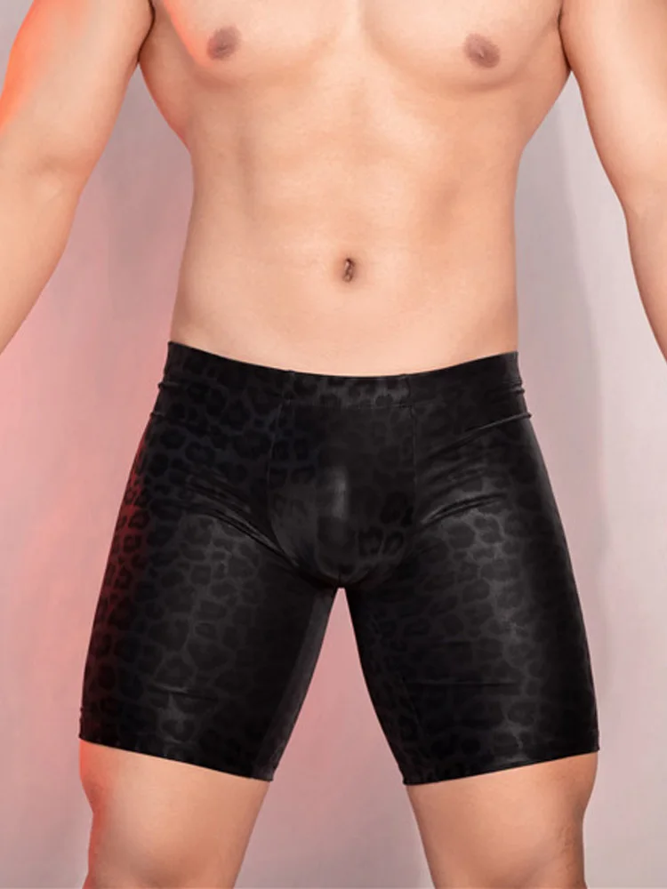 Sexy Men PU Faux Leather Leopard Print Short Pants U Bulge Pouch Pants Shorts Gym Boxer Wetlook Gay Wear Erotic Club Wear