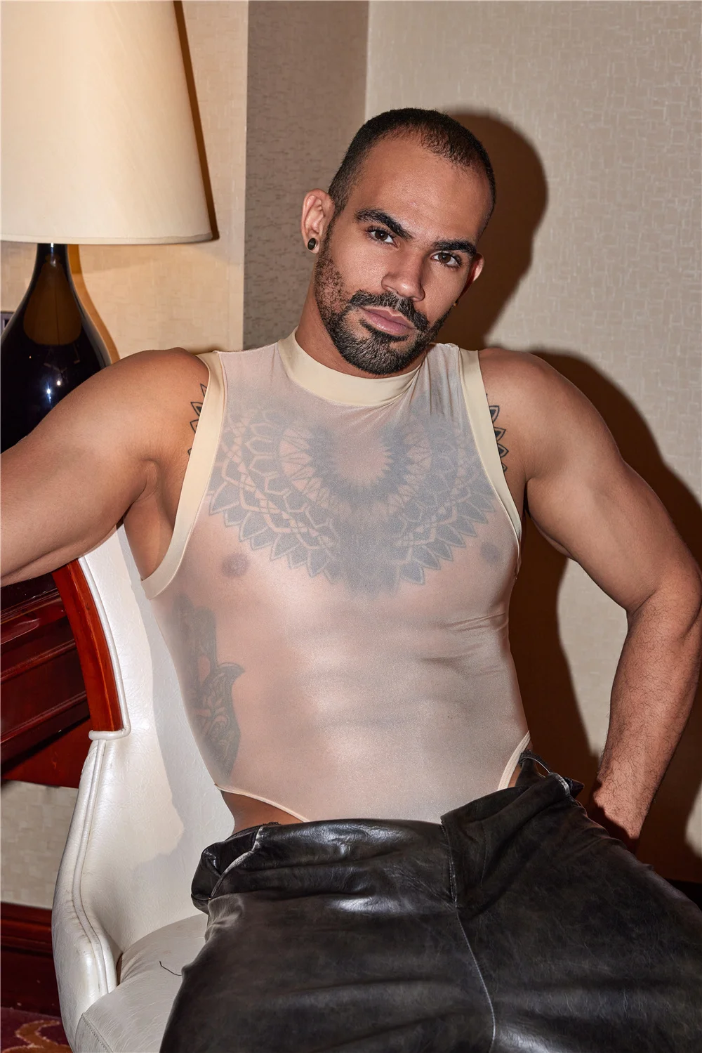 Sexy Men Unisex High Cut Bodysuit Oil Glossy Shiny Vets Sheer See Through Thong Maid Tights Elastic Tank Top Leotard